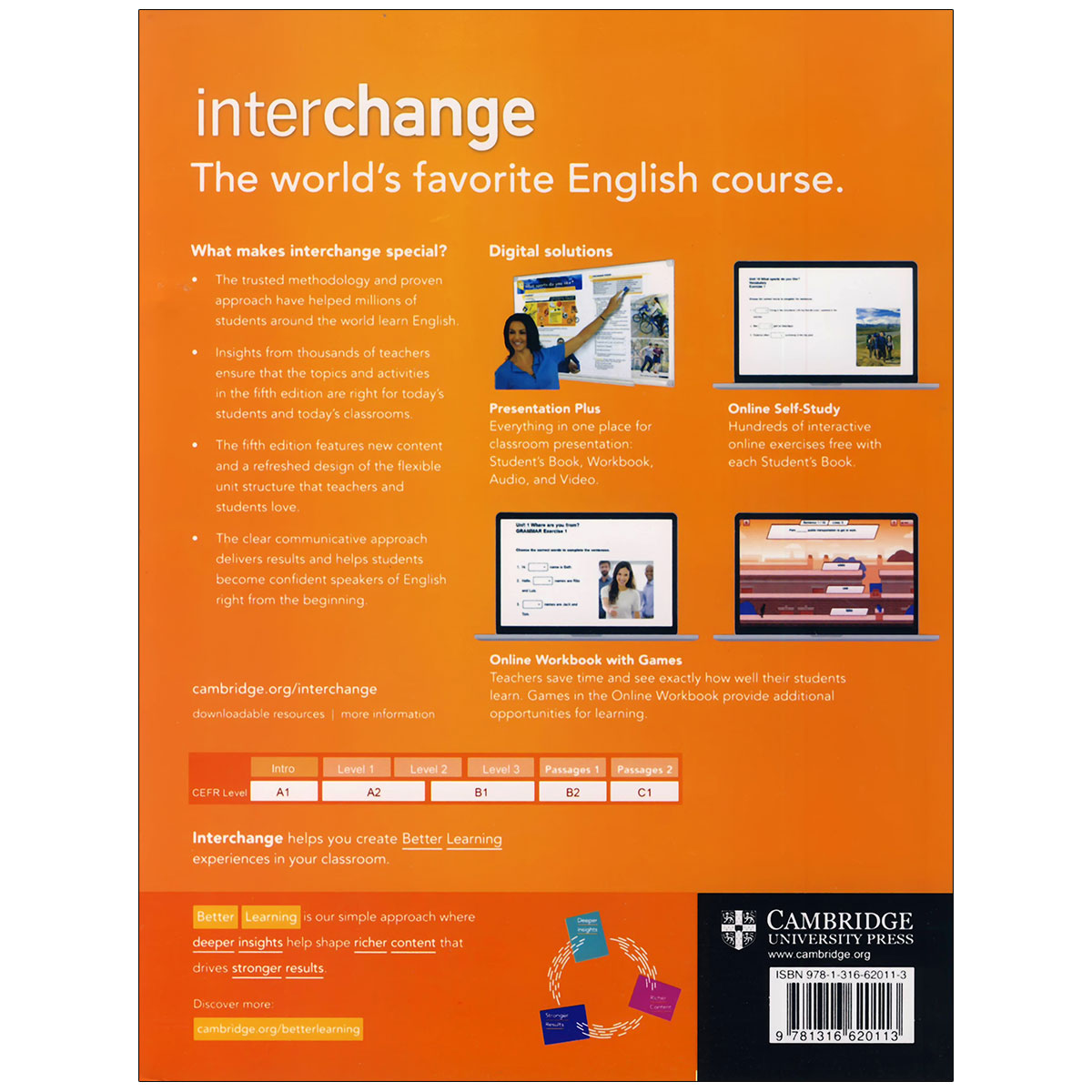 ویرایش پنجم اینترچنج Intro با محتوای شنیداری بهروز، تصاویر جذاب، و فعالیتهای کلاسی پویا طراحی شده است. تمرکز اصلی این مجموعه بر تقویت مکالمه و اعتمادبهنفس در صحبت کردن است. استفاده از این کتاب در کلاسهای زبان و آموزش خصوصی بسیار رایج و مؤثر است.